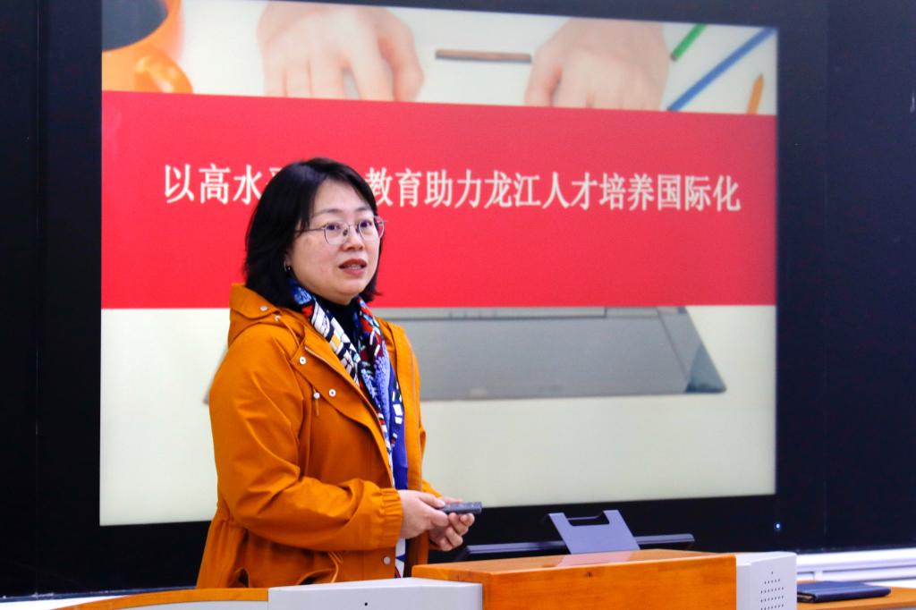 民盟黑大委员会主委祖雪晴以《以高水平特色教育助力龙江人才培养国际化发展》为题进行分享。祖雪晴通过对习总书记谈“一带一路”的200余篇文章的研读与梳理,总结分析了“一带一路”沿线教育市场主要特征,提出了“结合高校资源优势如何实现国际化人才培养‘为党育人、为国育才’的核心目的”的思考,并结合专业背景就6686如何发挥俄语优势,助力“一带一路”建设高质量发展阐释了工作心得。