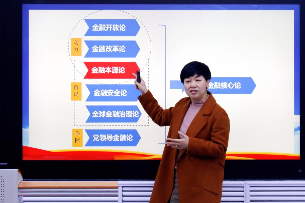 九三学社黑大委员会主委祝洪章以《习近平总书记关于金融工作重要论述》为题进行分享。她从党对金融工作集中统一领导的必要性,提升金融核心竞争力的重要战略意义,新时代金融工作核心任务等方面入手,围绕当前国际国内经济形势,结合最前沿的金融理论知识,阐释了习近平总书记金融工作重要论述的核心要义。