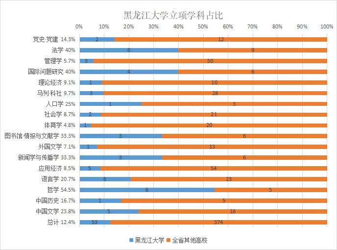 第一,从学科分布来看,涉及党史·党建、法学、管理学、国际问题研究、理论经济、马列·科社、人口学、社会学、体育学、图书馆·情报与文献学、外国文学、新闻学与传播学、应用经济、语言学、哲学、中国历史、中国文学等17个学科和领域,其中法学、语言学、哲学学科各获得6个项目,应用经济和中国文学学科各获得5个项目。哲学学科立项数量占全省54.5%,法学和国际问题研究学科立项数量均占全省40%,体现了我校相关学科的科研实力和龙头优势。