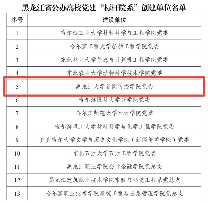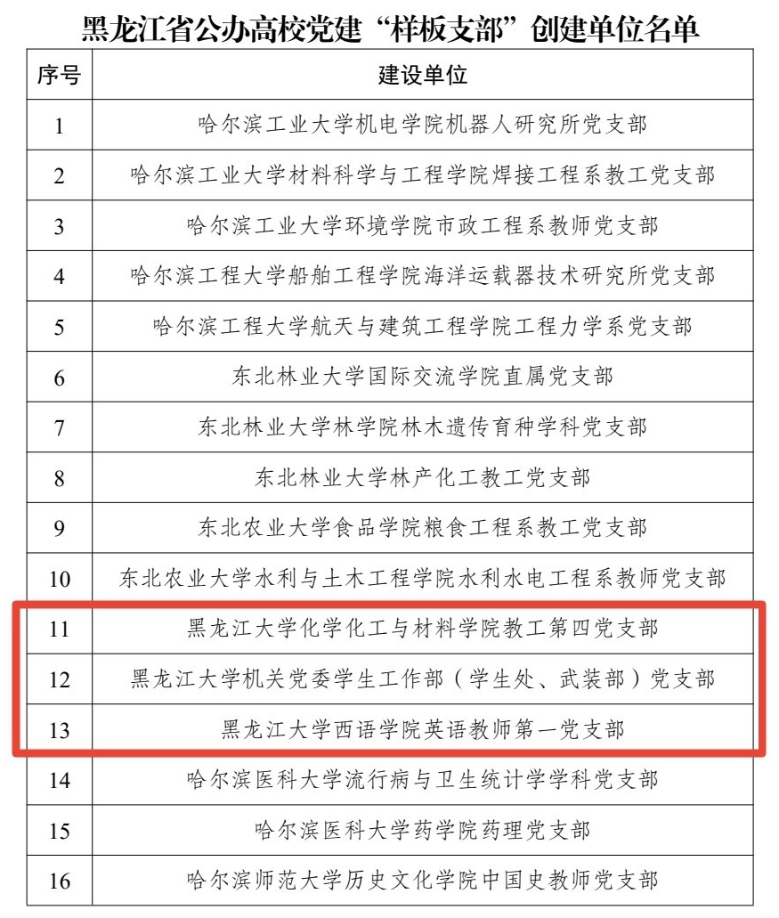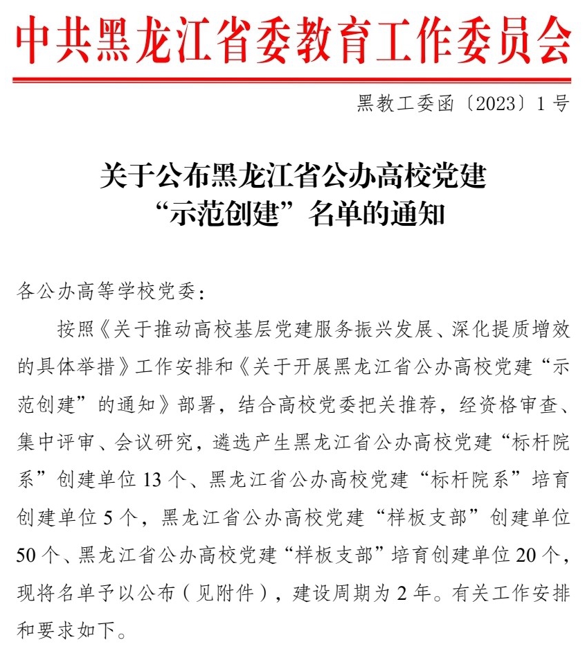 近日,省委教育工委正式发布《关于公布黑龙江省公办高校党建“示范创建”名单的通知》(黑教工委函〔2023〕1号),66864个基层党组织入选。其中,新闻传播学院党委入选黑龙江省公办高校党建“标杆院系”创建单位,化学化工与材料学院教工第四党支部、机关党委学生工作部(学生处、武装部)党支部、西语学院英语教师第一党支部入选黑龙江省公办高校党建“样板支部”创建单位。