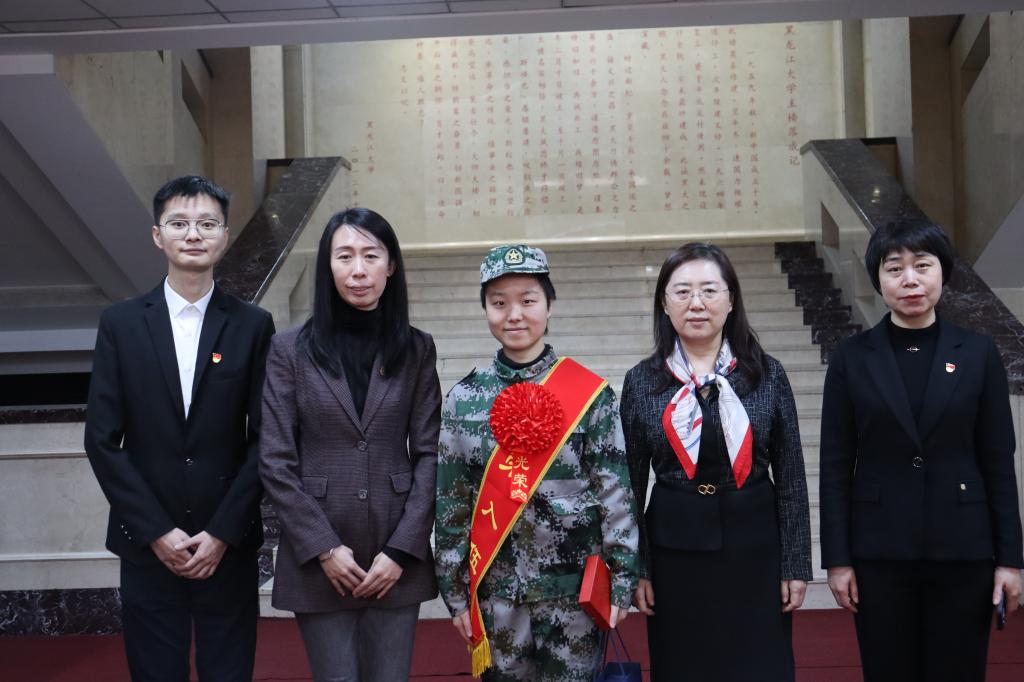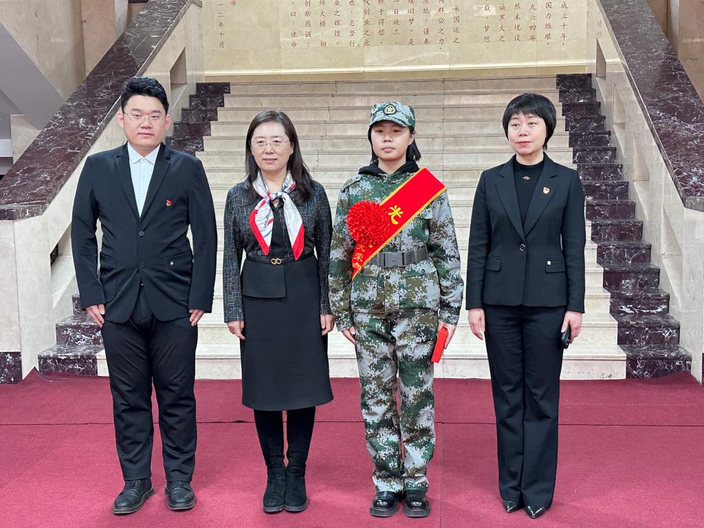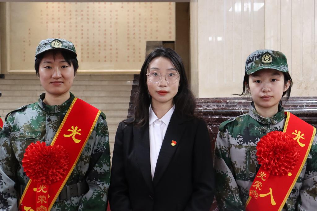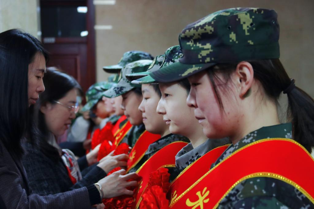 随后,出席领导、老师为预定女兵佩戴“光荣入伍”大红花、赠送校庆主题纪念书签。