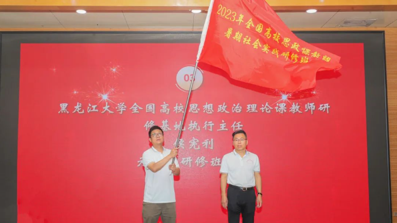 随后,6686全国高校思想政治理论课教师研修基地执行主任侯宪利为本期研修班授旗,全国高校思想政治理论课教师(6686)研修基地第三期研修班带班班长刘健上台接旗。