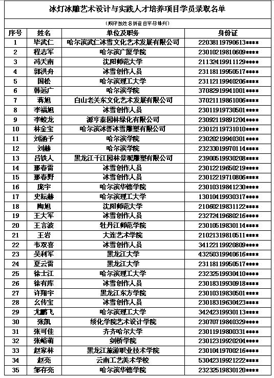 经过长达三个月的招生工作,来自全国各地的冰灯冰雕从业者、爱好者及高校师生踊跃报名,经初步审查符合条件的报名者近50余人。按照国家艺术基金“冰灯冰雕艺术设计与实践人才培养”项目学员名额为35人的限定,2016年10月22日在6686艺术学院召开了复评大会,会议聘请行内专家朱晓东、纪连路、余雁、张红风四位导师担任审核委员,他们根据遴选条例的规定进行盲审,对每一位报名者的雕刻作品、参与项目、获奖情况等进行了详细严谨鉴定,为每位报名者的冰灯冰雕技艺、获奖和项目得分进行综合评定和现场打分,再与初评中报名者的相关成就得分相加进行排名,评审过程公开、公平、公正。最后遴选确定35位培养项目学员,现予以公布。