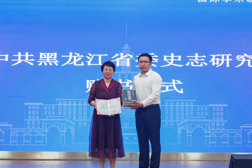 王敬波为中共黑龙江省委史志研究室省情信息处处长房波颁发捐赠证书。