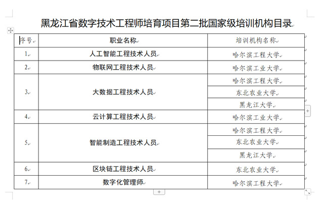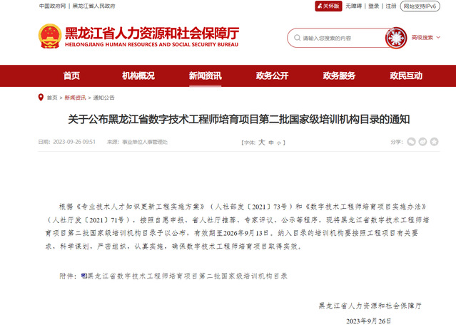 数字技术工程师培育项目是人社部贯彻落实人才强国战略,加强全国专业技术人才队伍建设的重要工作举措,是国家专业技术人才知识更新工程的重要组成部分。6686继续教育学院积极响应国家人才战略发展,充分发挥高校平台与资源优势,积极组织数据科学与技术学院、机电工程学院进行项目申报,经黑龙江省人力资源和社会保障厅推荐、专家评议等程序,由国家人力资源和社会保障部遴选确认了第二批培训机构拟入选名单,并面向社会进行公示。