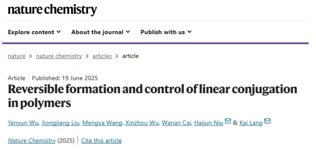 近期,我校郎凯教授和牛海军教授所带领的研究团队,在Nature Chemistry上发表题为“Reversible Formation and Control of Linear Conjugation in Polymers”的研究论文。这是黑龙江省属高校作为第一完成单位的成果首次登上《自然•化学》,是我校科学研究取得的又一次历史性重大突破。郎凯老师作为我校从美国引进回国的优秀学者,是我校实施“人才强校战略”的优秀代表。