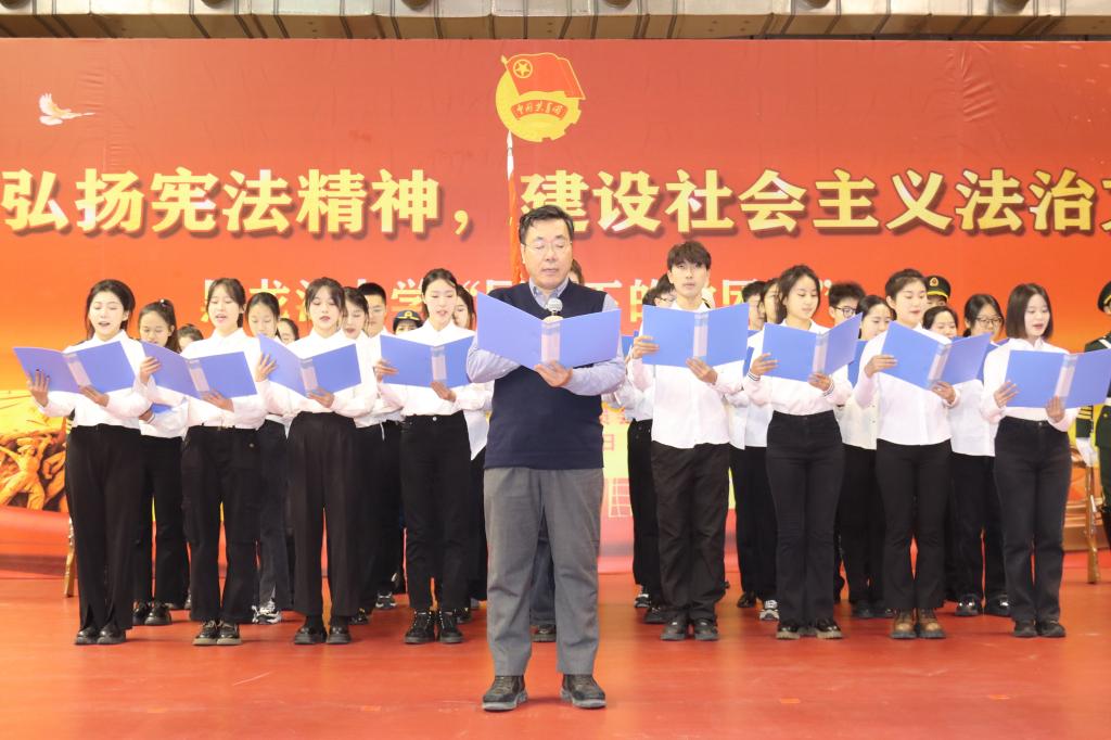 为深入学习党的二十大精神,学习宣传贯彻习近平法治思想,大力弘扬宪法精神和社会主义法治精神,12月4日早,学校在体育馆举行“大力弘扬宪法精神,建设社会主义法治文化”国旗下的微团课。校党委副书记丁宏,党委学工部、校团委、法学院师生代表300余人参加活动。法学院党委书记孙世萍主持活动。
