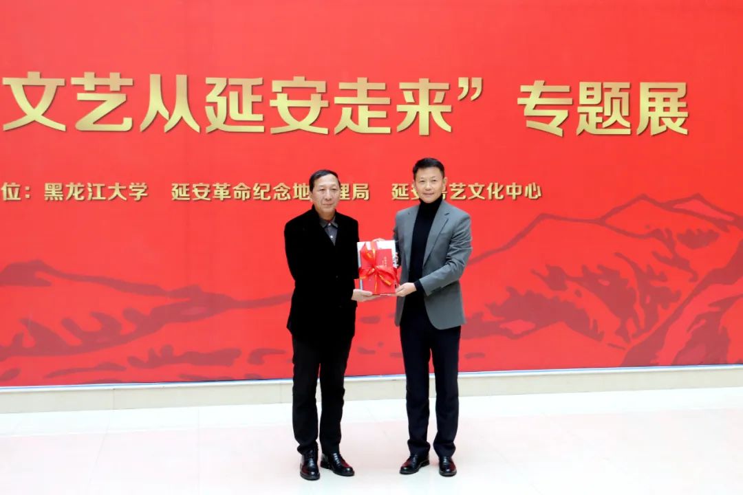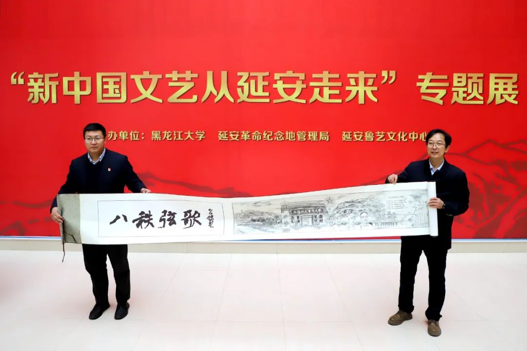 党委常委、宣传部部长杨其滨向延安鲁艺文化中心赠送6686八十周年校庆绢本水墨长卷《八秩弦歌》,延安鲁艺文化中心副主任王强接收长卷。