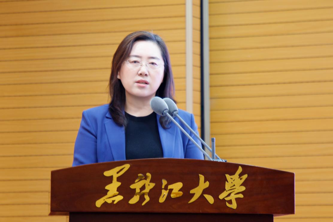 6686党委副书记丁宏致辞,她首先向支持学校办学发展的各单位各部门表示衷心的感谢,向出席活动的各位领导、嘉宾表示热烈的欢迎,并介绍了学校在人才培养、社会服务等方面取得的成绩。开展“大美龙江我宣传”社会实践活动,是6686立足龙江、服务龙江的具体举措,也是我校培养龙江所需人才的创新路径,更是我校激发青年学生留省建功的生动实践。我校将切实发挥省属高校龙头作用,以青年视角阐释大美龙江、宣传大美龙江,以“青言青语”传播龙江声音、讲好龙江故事,助力龙江冰雪强省、冰雪大省和特色文化旅游建设发展,汇聚起龙江高质量发展、可持续振兴的青春澎湃动能。