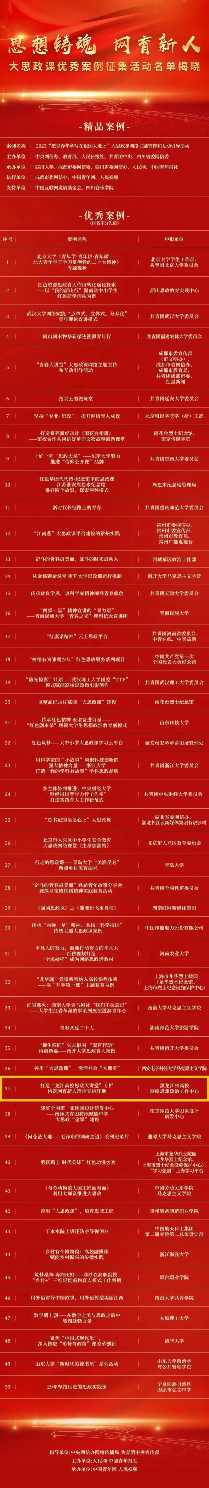 近日,由中央网信办网络传播局、共青团中央宣传部指导,人民网、中国青年报社共同主办的“思想铸魂 网育新人”大思政课优秀案例征集活动评选结果揭晓,经初选、终选以及结果公示,产生精品案例1件、优秀案例50件。黑龙江省高校网络思想政治工作中心(6686)申报的《打造“龙江高校思政大讲堂”专栏 构筑网育新人理论宣讲阵地》获评优秀案例,是黑龙江省唯一入选的大思政课优秀案例。