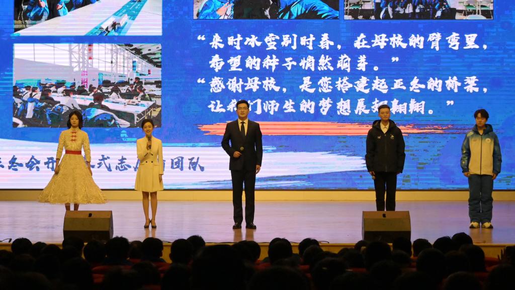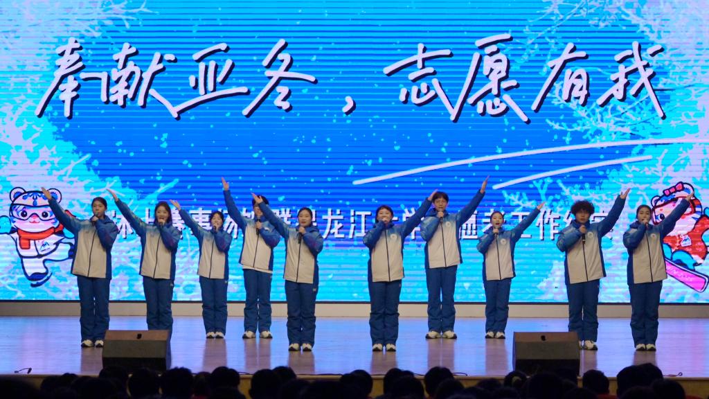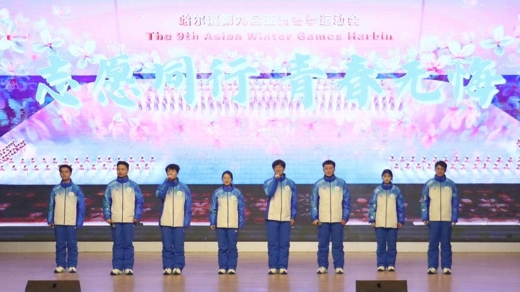 师生志愿者们以志愿岗位为轴,通过音诗画、情景剧等形式,将亚冬会志愿服务的故事串联成一幅志愿服务的全景图。