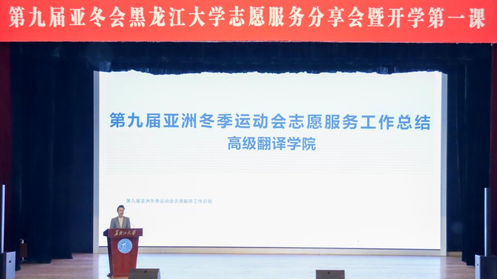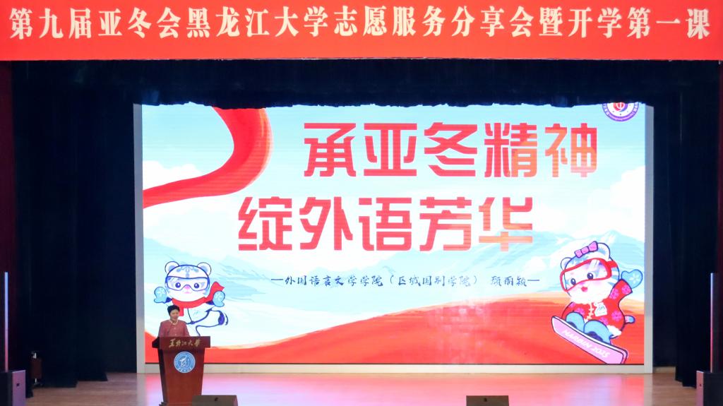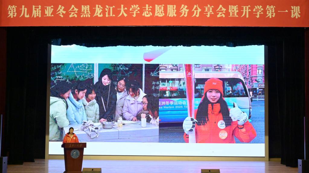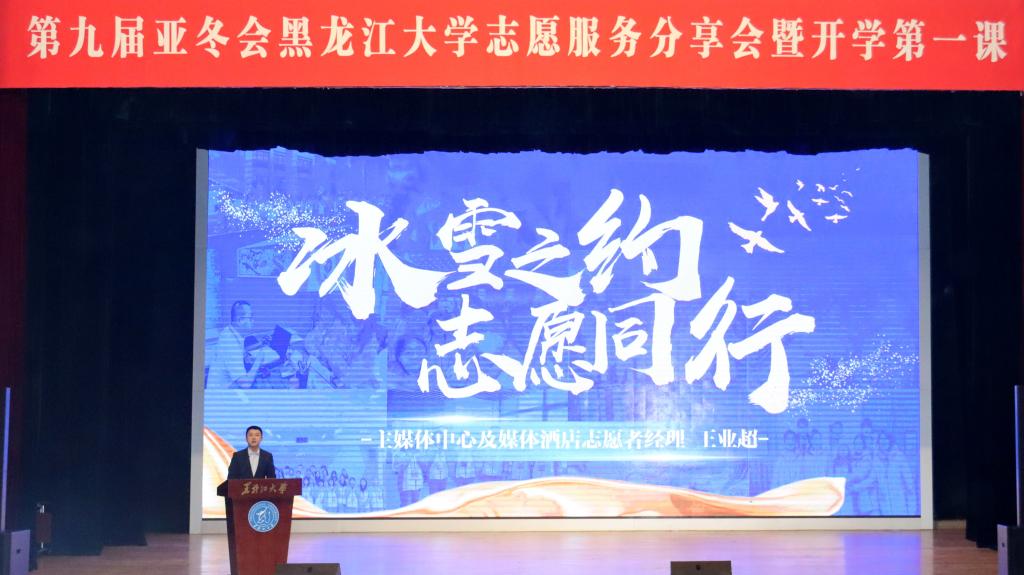 迟宝旭以《在服务国家大事中淬炼青春本色》为题讲授开学第一课。他高度肯定了师生志愿者们在亚冬会期间的出色表现,并提出三点希望:一是传承亚冬精神,做志愿服务的“燎原星火”。以亚冬会志愿服务中锤炼的奉献精神、国际视野和团队意识为根基,将个人成长融入国家发展大局,辐射带动更多青年投身乡村振兴、基层治理等国家战略一线,用实践磨砺品格,以行动诠释“奉献、友爱、互助、进步”的志愿精神与黑大精神。二是深耕专业赋能,做知行合一的“时代新人”。亚冬会证明专业素养与综合能力是服务社会的“硬实力”。立足学风建设年,需以自律、创新、诚信为内核,精进学业、锤炼本领,成长为德才兼备的栋梁之材。三是勇担振兴使命,做扎根龙江的“青春先锋”。依托“赛会服务+思政育人+社会辐射”体系,将亚冬热情转化为服务龙江振兴的动能,聚焦数字经济、冰雪经济、人工智能等“4567”现代产业领域,勇当开路先锋,以青春智慧助力中国式现代化龙江篇章。