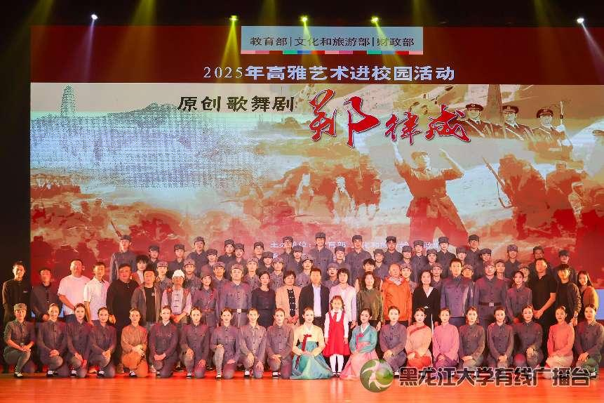 歌舞剧《郑律成》的成功演出,不仅为学校建校84周年增添了红色文化注脚,更将“高雅艺术+红色基因”的元素融入校园文化体系,通过师生自发跟唱经典旋律、演出后热议抗联精神等场景,让红色文化从“舞台呈现”走向“日常共鸣”。两校以《郑律成》为纽带,共同丰富了校园文化的内涵,让红色主旋律成为校园文化建设的核心底色。