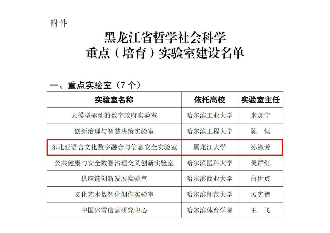 近日,2023年度黑龙江省哲学社会科学重点(培育)实验室建设名单公布,全省共建设重点实验室7个、培育实验室6个,其中,我校俄语学院孙淑芳教授作为实验室主任牵头申报的“东北亚语言文化数字融合与信息安全实验室”获批重点建设实验室。