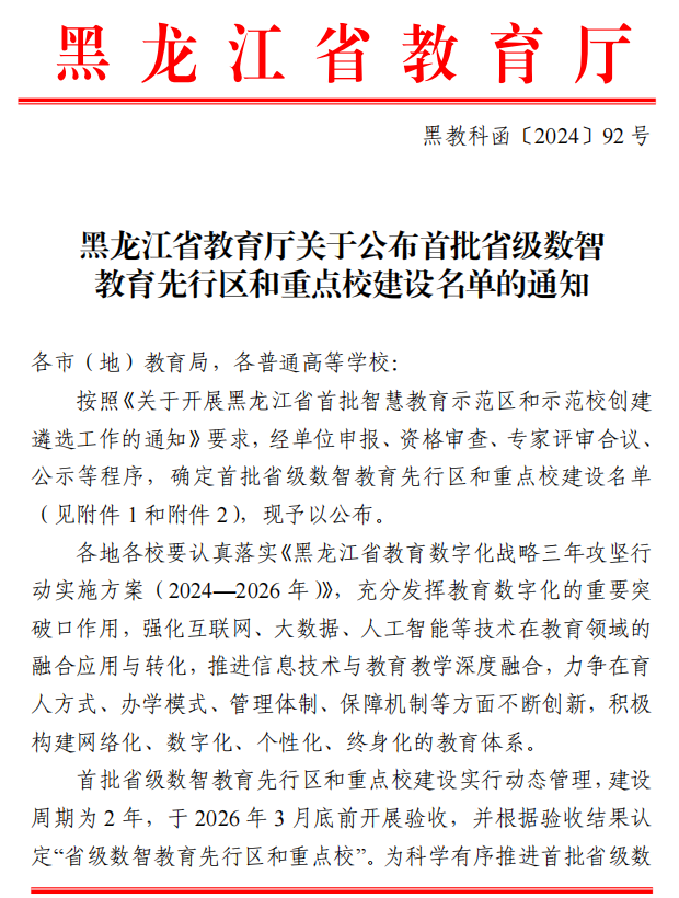 根据《关于开展黑龙江省首批智慧教育示范区和示范校创建遴选工作的通知》要求,我校组织申报的“推进‘AI+教育’融合应用,建设‘一核两翼三转四联’的智慧校园”选题,经学校申报、资格审查、专家评审合议、公示等程序成功入选首批省级数智教育重点校。