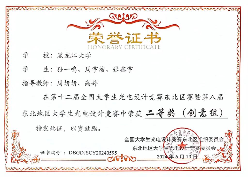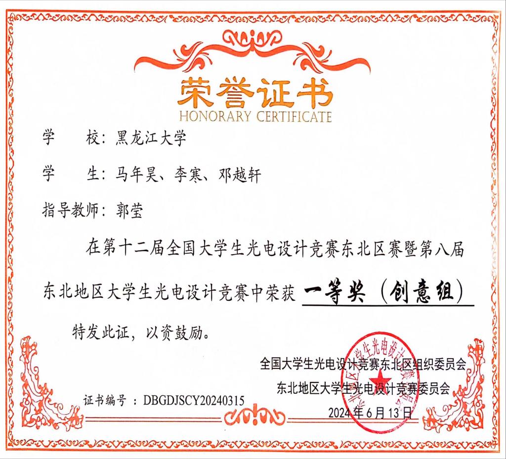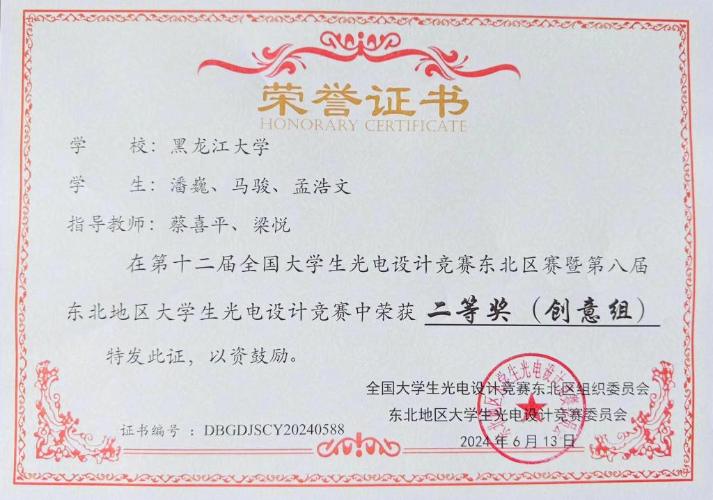 6月10日-6月13日,第十二届全国大学生光电设计竞赛东北区赛暨第八届东北地区大学生光电设计竞赛在黑河学院举办。本次竞赛吸引了来自东北地区48所高校的1268支队伍,共计5741名师生参赛,经初步评审后,有120支队伍进入决赛路演环节。由我校化学化工与材料学院学生单彤、刘晓润、制药工程专业学生金旭阳组成的光盾先锋队和电子工程学院学生马年昊、李寒、邓越轩组成的光音奇想队两只参赛队伍代表6686进行了路演决赛的角逐。最终,单彤团队的作品《光影密码—引领防伪新纪元》(指导教师:周妍妍、李洪峰)和马年昊团队的作品《光影交响—用光传递声音,领略可见光通信》(指导教师:郭莹)均荣获大赛一等奖。同时,我校化学化工与材料学院学生孙一鸣团队的作品《科技引领,绿色为先-环保平胺新方法》荣获大赛二等奖(团队成员:周宇洁、张鑫宇;指导教师:周妍妍、高婷),我校物理科学与技术学院学生潘巍、马骏、孟浩文的作品《智能导盲杖》(指导教师:蔡喜平、梁悦)荣获大赛二等奖。