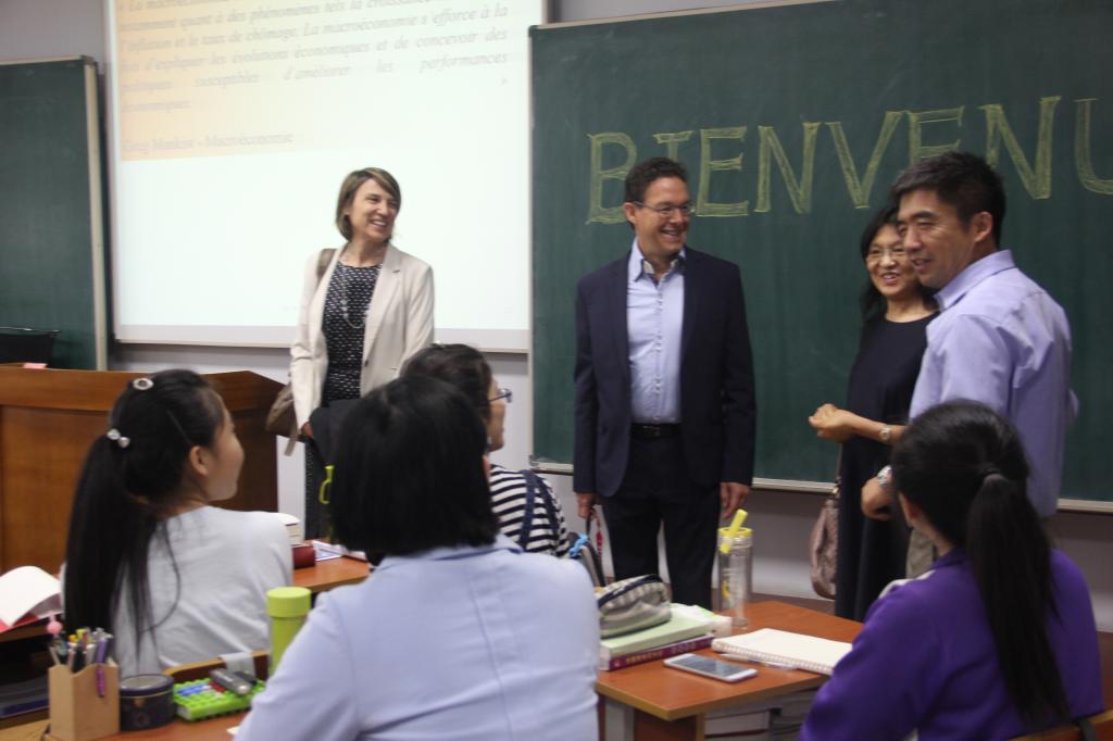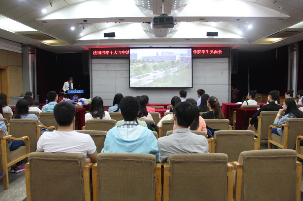 巴黎第十大学代表团上午参观了中法学院,与学生进行了见面。在中法学院院长焦方义、中法学院法语教学负责人周振华的陪同下,代表团一行参观了中法学院的教学及管理设施,并走进每间教室与每一届中法学院学生进行交流互动。学生们为代表团献上了鲜花和带有中法学院LOGO的学院徽章。上午10时,代表团在外事多功能厅与全院学生见面。法方副校长乐舒介绍了巴黎十大的发展历史和概况;中法学院法方行政副院长、国际交流主任韩淑艳女士就两校的合作情况展开发言,并表达了对中法学院学生的殷切希望;中法学院经济学院负责人、经济学院经济系主任Baudry Marc教授围绕经济学院的专业设置、课程类型、考试要求等具体情况发言。见面会现场,代表团就学生们的疑问做出了详尽的解答。会后,舒乐副校长亲帅代表团逐一面试了我校中法学院即将出国学习的全部学生,面试后,代表团对学生的法语沟通能力以及金融专业知识掌握水平给予了高度评价。