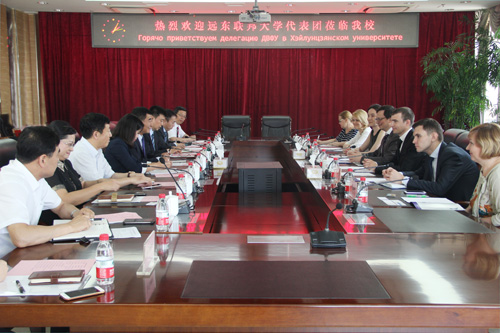 随后,双方代表就孔子学院发展,培养中俄友好多领域人才等项目深入交换了意见。我校中俄学院院长贾旭杰向远东联邦大学代表介绍了中俄学院三阶段“俄语+专业”的培养方案和取得的成绩,建议在本科和硕博两个阶段,分别以赴俄进修和创立中俄联合研究生学院的方式进一步开展合作。
