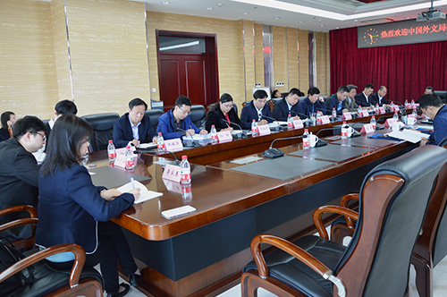 2017年5月23日上午,MTI教育指导委员会主任委员、翻译专业资格(水平)考试英语专家委员会主任委员、国际译联原副主席、中国外文局原副局长兼总编辑黄友义,中国外文局翻译专业资格考评中心副主任杨建平等一行4人,就我校外语办学情况和师生参加翻译资格考试的情况进行调研考察。我校副校长严明,研究生学院、教务处、俄语学院、西语学院、东语学院、中俄学院、应用外语学院等学院领导及教师代表出席了座谈会。