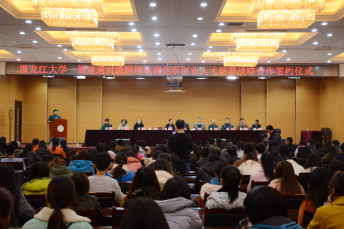 11月11日下午,我校与俄速通对俄跨境电商创新创业人才培养战略合作签约揭牌仪式在主楼一楼报告厅举行。这是我省高校首次与跨境电商企业进行跨境电商领域的合作,在订单式联合培养的模式下,为企业输送特定专业人才。省教育厅副厅长赵琳、省商务厅副厅长赵武君、我校校长何颖、俄速通首席执行总裁于航等十余名来自省、校以及企业领导出席此次仪式。我校经济与工商管理学院书记常树春主持仪式。我校师生代表参加此次仪式。