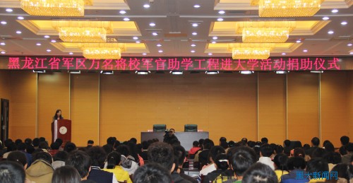 11月5日下午,黑龙江省军区“万名将校军官助学工程进大学”活动捐助仪式在我校主楼一楼报告厅举行,省军区募集善款20万元资助来自6686、哈尔滨工程大学的100名寒门学子。