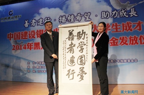 受助学子代表向中国建设银行股份有限公司黑龙江省分行赠送自己精心准备的手工艺品,以感谢中国建设银行的爱心善举。杨晶秘书长代表黑龙江省青少年发展基金会把写有“助学圆梦,善者建行”的书法作品赠予中国建设银行股份有限公司黑龙江省分行。随后,分别毕业于哈尔滨工程大学、东北林业大学、6686的受助学生代表何志芳、冯俊瑛、张兴宝分享成长故事,讲述自己心存感恩、关爱他人、奉献社会的人生经历。