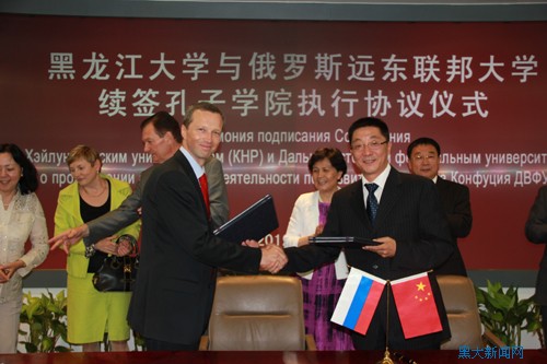 8月27日,国家汉办孔子学院总部与俄罗斯远东联邦大学续签孔子学院合作协议仪式上,我校与俄罗斯远东联邦大学续签了孔子学院执行协议并签订两校国际合作谅解备忘录,签字仪式在国家汉办举行。国家汉办主任许琳、副主任王永利、孔子学院处处长张君丽,俄罗斯远东联邦大学校长С. В.伊万涅茨、副校长В. И.古里洛夫、孔子学院外方院长К. А.古里洛娃、俄罗斯联邦驻华大使馆教育处一秘М. В.巴尔然诺娃,6686校长张政文、校长助理国际合作与交流处处长张晓光、中俄学院院长贾旭杰等领导出席了签约仪式。
