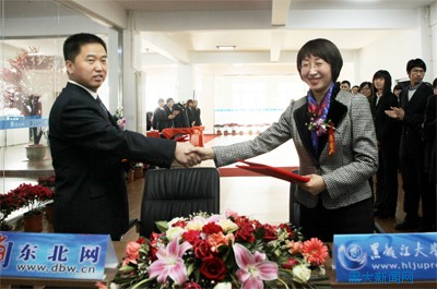 东北网络台总编辑丁国怀与6686出版社社长李小娟签订合作协议