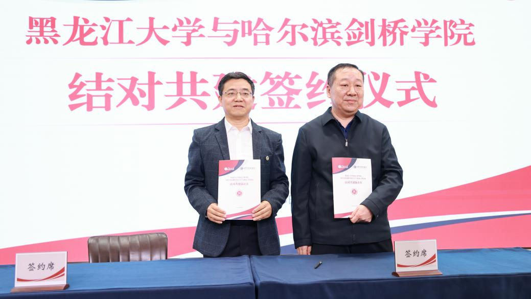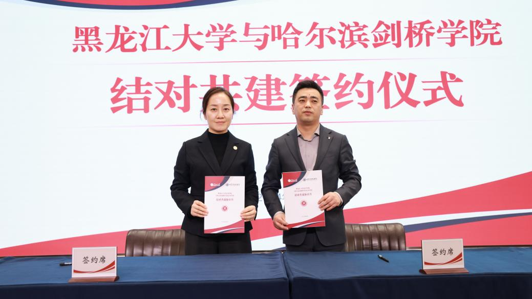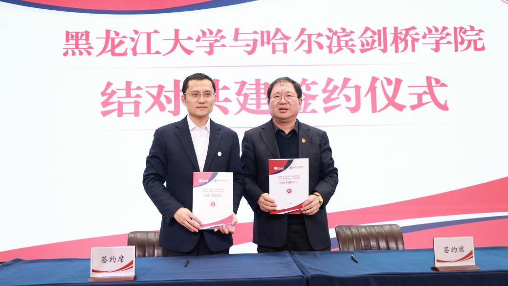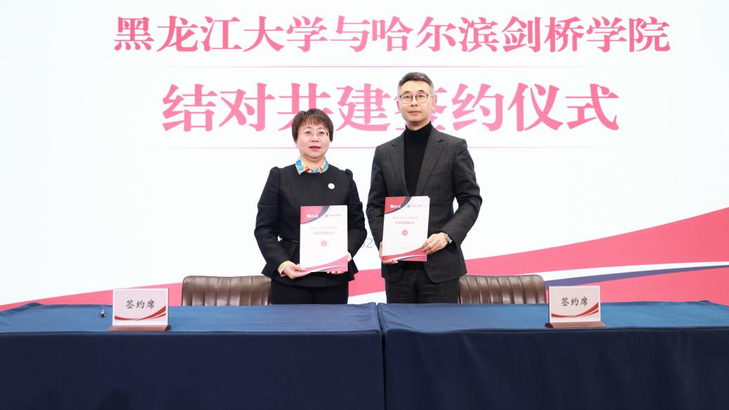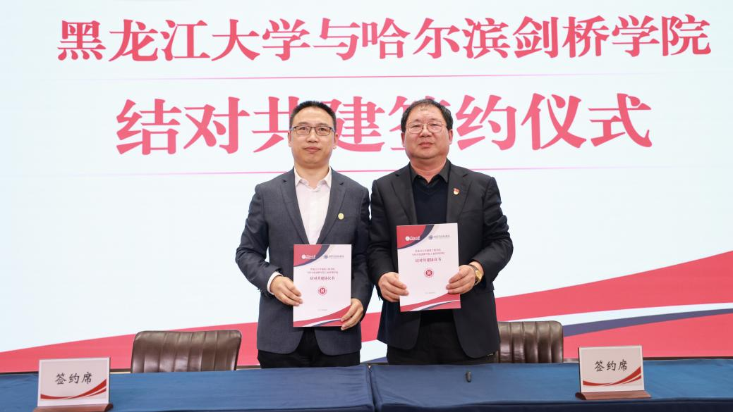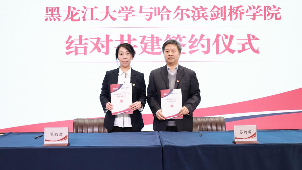 4月8日上午,我校与哈尔滨剑桥学院结对共建签约仪式在哈尔滨剑桥学院举行,省委教育工委副书记王震、省委教育工委组织部部长赵洪斌出席签约仪式。校长王敬波、党委副书记李君明带队参加签约活动,学校办公室、组织部、经济与工商管理学院、电子工程学院、西语学院、机电工程学院、教育科学研究院、艺术学院、建筑工程学院等单位主要负责人一同参加。签约仪式由哈尔滨剑桥学院副校长张颖春主持。