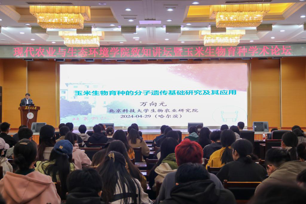 座谈会召开前,在学校主楼一楼报告厅举办了现代农业与生态环境学院致知讲坛暨玉米生物育种学术论坛。北京科技大学生物农业研究院万向元教授围绕“玉米生物育种的分子遗传基础研究及其应用”,中国农业大学农学院田丰教授围绕“玉米驯化与适应的分子机制”,华中农业大学生命科学技术学院代明球教授围绕“玉米抗旱机制解析与遗传改良”分别做了专题报告。我校现代农业与生态环境学院及相关学院师生近200人参加了本次论坛,院长李丽教授主持。