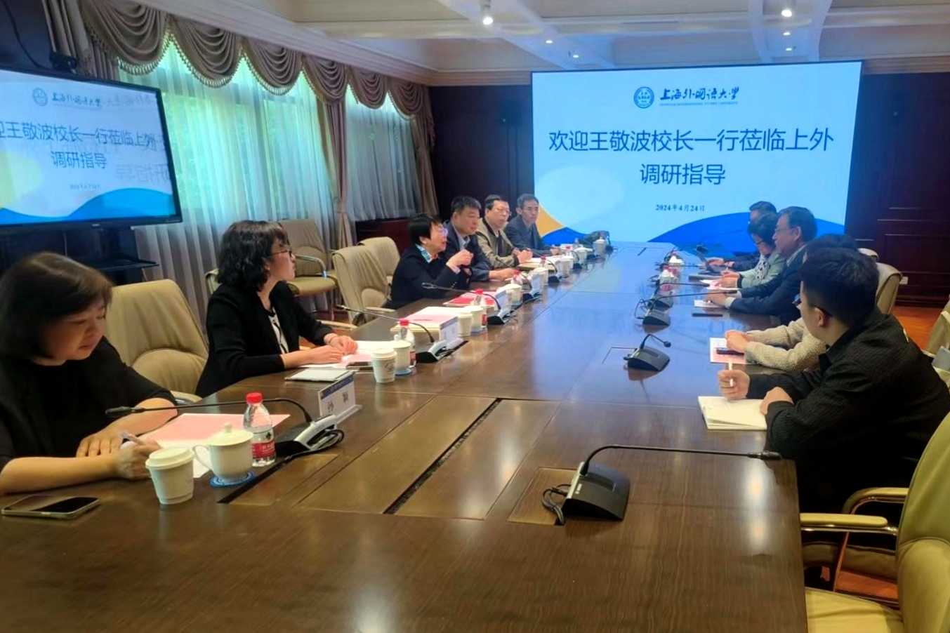 4月23日-24日,校长王敬波、原副校长严明带队赴上海外国语大学调研交流。上海外国语大学校长李岩松,原党委书记姜锋,校长助理胡开宝,有关部门负责同志,以及我校学校办公室、俄语学院、西语学院、东语学院、俄罗斯语言文学与文化研究中心有关负责同志参加走访调研和座谈活动。