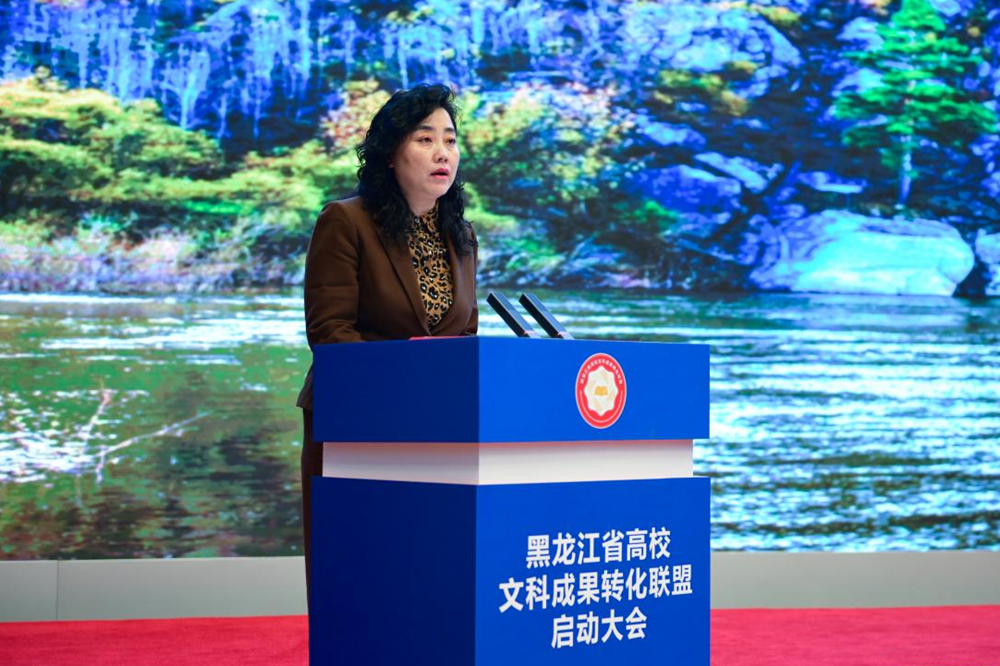 王敬波代表理事长单位致辞。她对省教育厅的指导关心和各联盟理事单位的信任及大兴安岭地区的支持表示感谢。她指出,成立联盟是贯彻落实习近平总书记考察黑龙江时强调“牢牢把握在国家发展大局中的战略定位,奋力开创黑龙江高质量发展新局面”重要指示精神的措施,是组织省内高校全面服务我省全面振兴全方位振兴的具体行动。她强调,作为理事长单位,6686要在组织体制保障方面发挥好应有作用,做各联盟成员的服务员、联络员、引导员,将与联盟高校合力,紧紧围绕服务向北开放等国家重大战略,紧紧盯住服务龙江全面振兴等目标,多渠道整合创新资源,建设各类转化要素集聚的资源信息库,实现文科成果精准对接,有效提升科研成果转化效能,把联盟打造成为促进我省文科成果转化跨越式发展的创新平台,助力龙江经济高质量发展。她表示,联盟启动大会在漠河市举办,是6686“人才、数字化、国际化、服务龙江”四大办学战略中“服务龙江”战略的具体体现。不久前,6686举行了“校地合作发展签约仪式”,与漠河市等19个县(市、区)签订了校地合作发展协议,此次活动是推进校地合作的具体实践。
