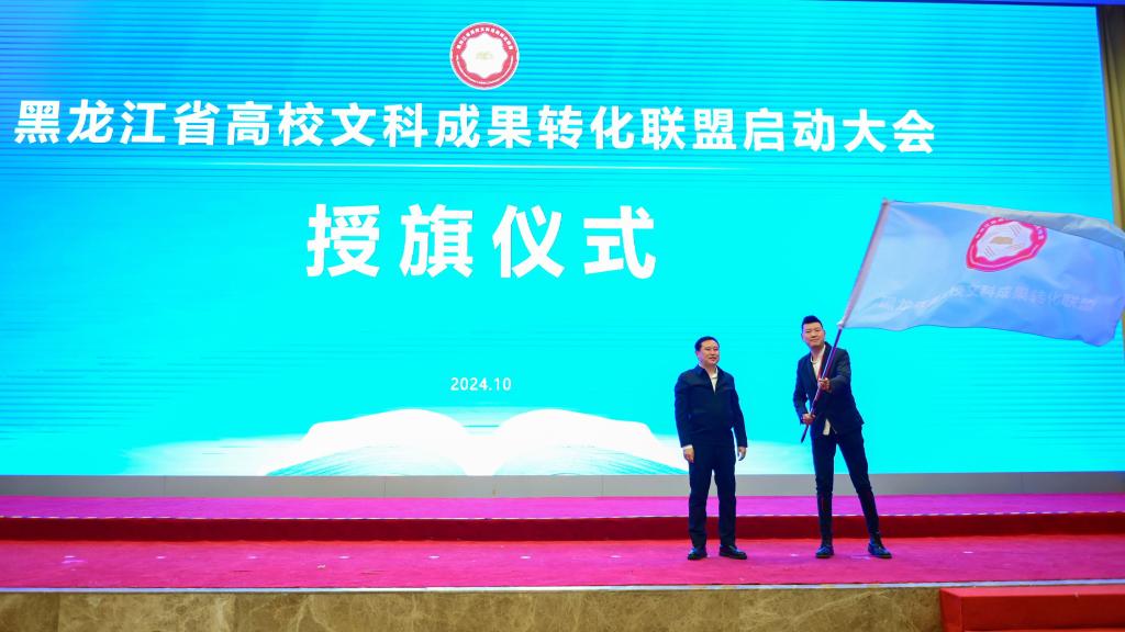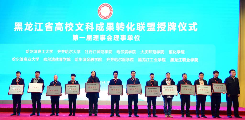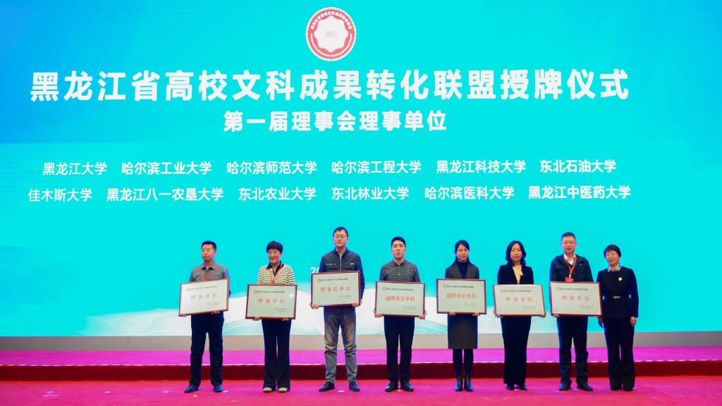 潘俊霞、王敬波、王跃然、李林及7家联盟理事单位相关负责人共同启动“黑龙江省高校文科成果转化联盟”。