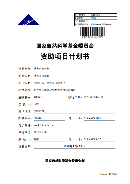 2020年,国家自然科学基金重大研究计划,高性能团簇电致发光材料与器件。