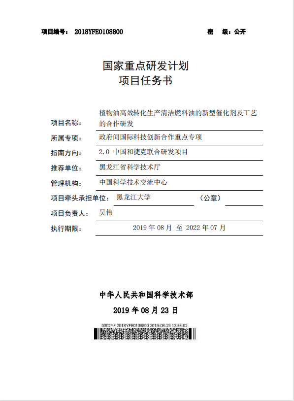 2019年,国家重点研发计划中国和捷克联合研发项目,植物油高效转化生产清洁燃料油的新型催化剂及工艺的合作研发。