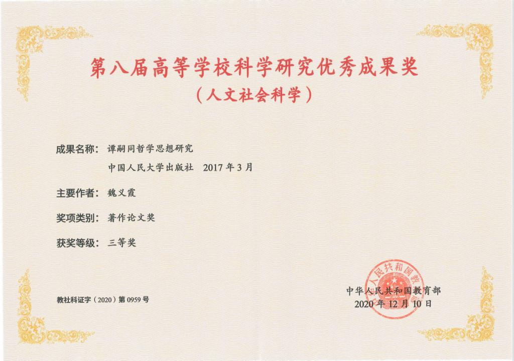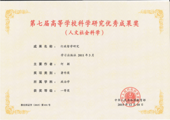 在教育部第六、七、八届高等学校科学研究优秀成果奖(人文社会科学)中,共获得一等奖2项、二等奖2项、三等奖10项、青年奖1项,单项获奖数量及获奖总数均为全省第一。