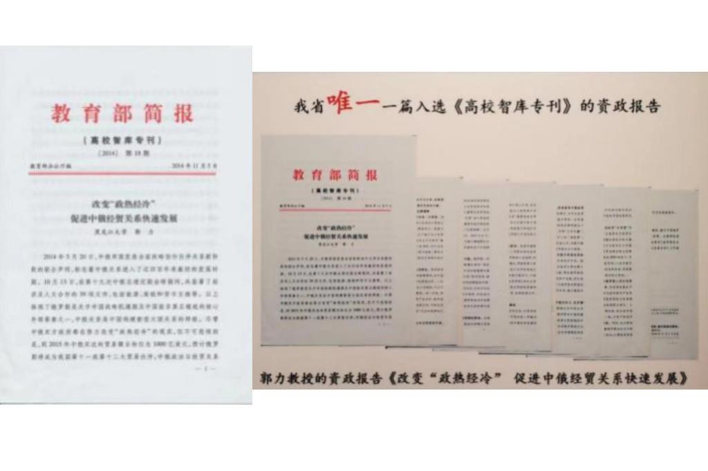 2014年11月,郭力教授的咨政报告《改变“政热经冷”促进中俄经贸关系快速发展》被教育部《高校智库专刊》采纳。