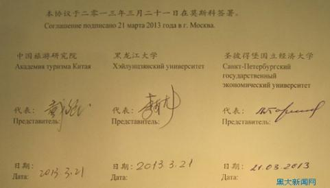 2013年3月,时任国务院副总理汪洋(后排右一)、俄罗斯联邦副总理戈洛杰茨(后排左一)共同见证中俄全面战略协作协同创新中心牵头单位6686、中国旅游研究院与圣彼得堡国立经济大学签署关于旅游科研、教育与国际交流的三方合作协议。