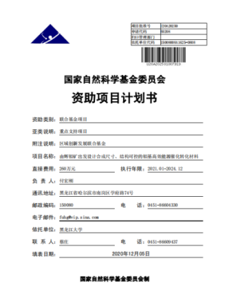 2020年,国家自然科学基金黑龙江联合基金,由辉钼矿出发设计合成尺寸、结构可控的钼基高效能源催化转化材料。