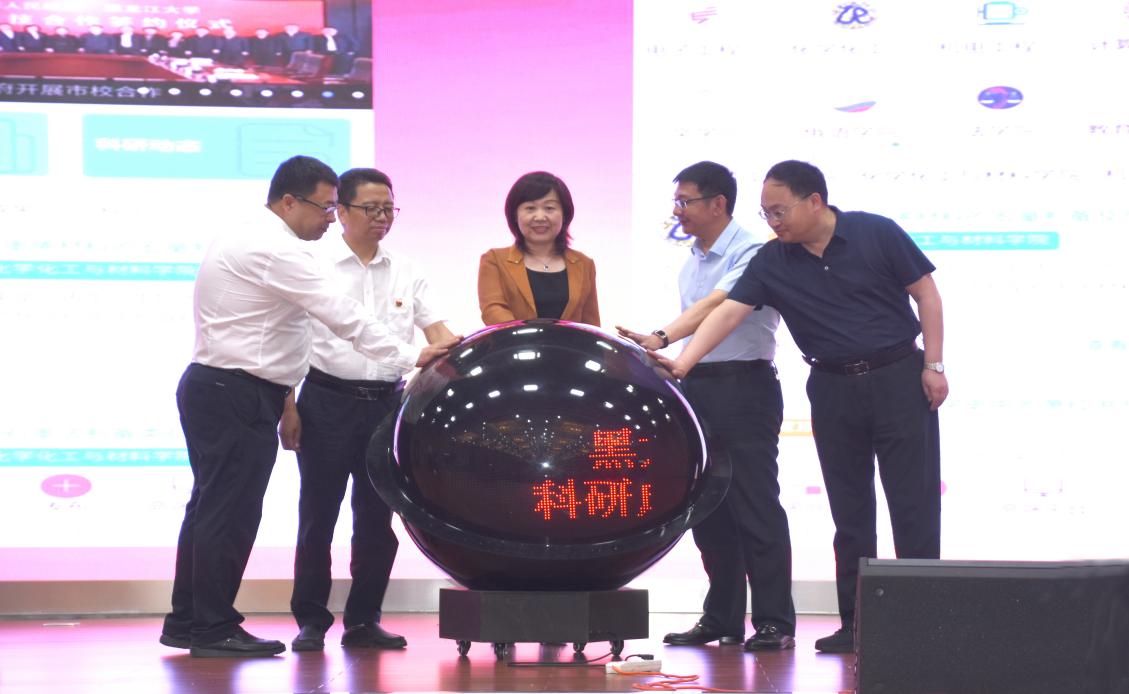 于文秀副校长、绥化市科学技术局党组书记武力生、双鸭山市科技局局长徐广久、黑河市科技局局长张战勇、大兴安岭地区科技局局长王新宇共同启动“6686科研成果发布系统”。
