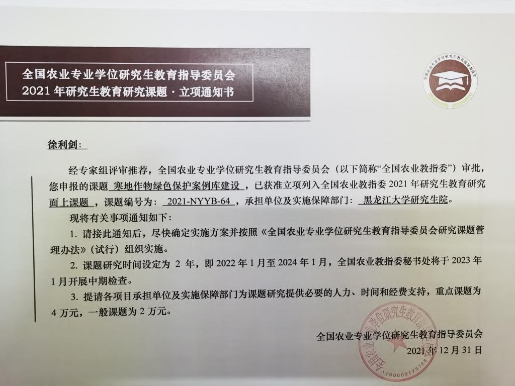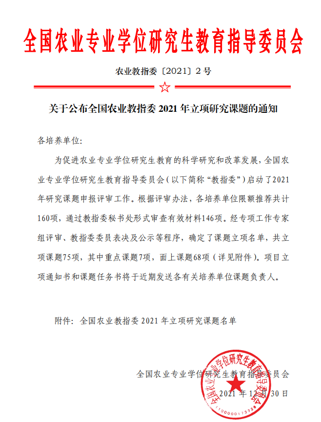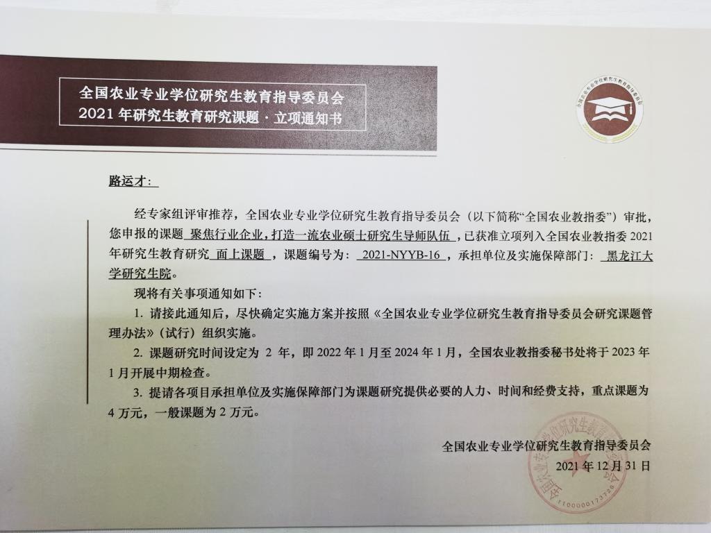 全国农业专业学位研究生教育指导委员会研究课题是为促进农业专业学位研究生教育的科学研究,推动模式机制创新和深化综合改革而设立的专业学位研究生培养改革项目,2021年度全国共立项75项,黑龙江省获批12项,我校获批3项,为省内唯一获批立项的非农林类高校。