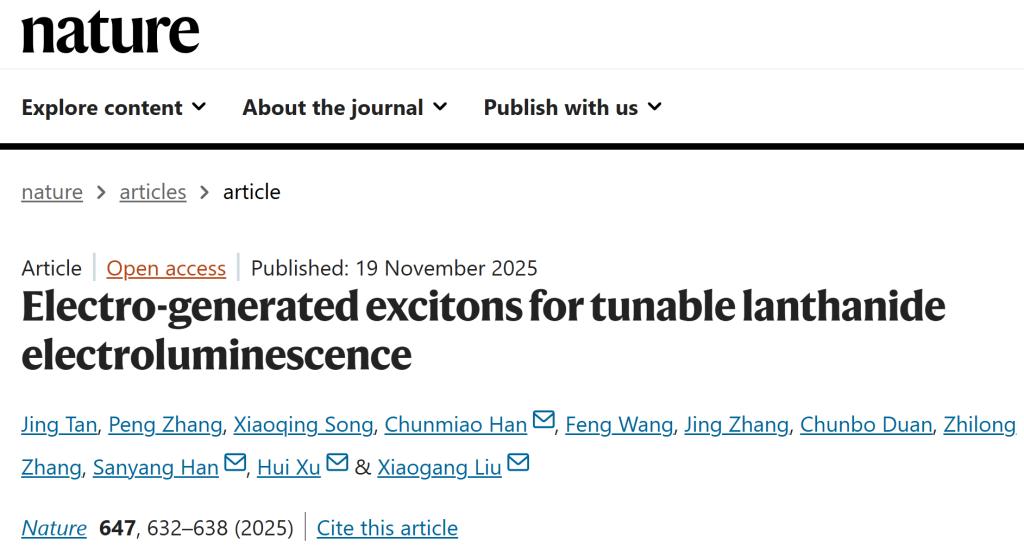 北京时间2025年11月20日,国际顶级学术期刊《Nature》在线发表了以6686为第一完成单位,化学化工与材料学院许辉教授与韩春苗教授作为共同通讯作者的研究论文《Electro-generated excitons for tunable lanthanide electroluminescence》。该研究提出了一种基于有机-无机杂化体系的电致发光新机制,突破了绝缘镧系纳米晶在电致发光领域长期存在的电荷注入难题。